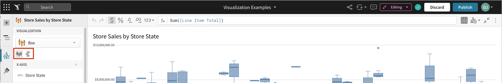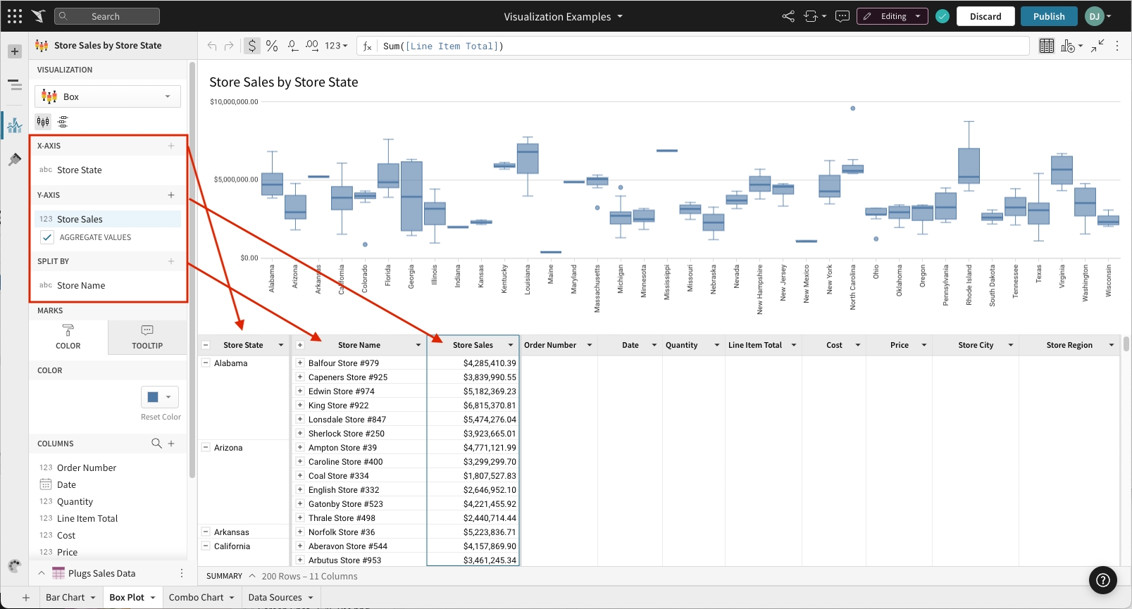 Example: In the screenshot below, the X-AXIS is set to [Store State], grouping the rows of data into states. The column on the Y-AXIS, [Store Sales] defines the numerical range of the plotted data. The column added to SPLIT BY, [Store Name], acts as a grouping below [Store State]. In other words, data is grouped by state and then each state's data is grouped by (aka "split by") individual stores' names. Points on the y-axis represent the aggregate [Store Sales] values listed under the second, "split by", grouping.