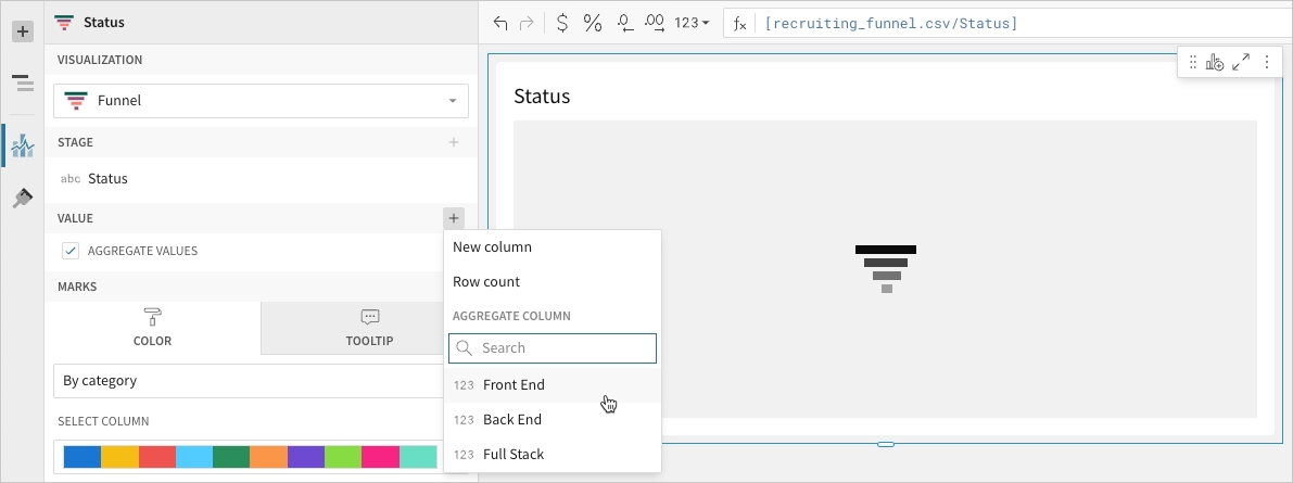 • To aggregate values of an existing column, search or scroll the Aggregate column list and select the preferred column name.