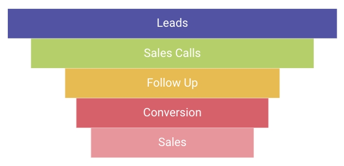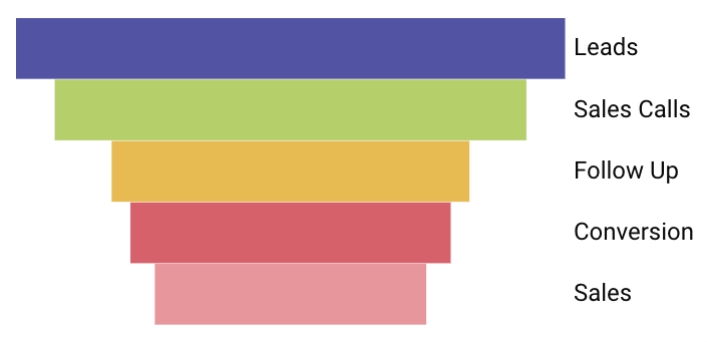 In a funnel chart, stages reference nominal categories (like campaign pipeline, sales pipeline, recruitment stages) presented as a horizontal bars. A variable measures a value (like number of leads, prospects, candidates) for each stage and determines the width of each bar.
