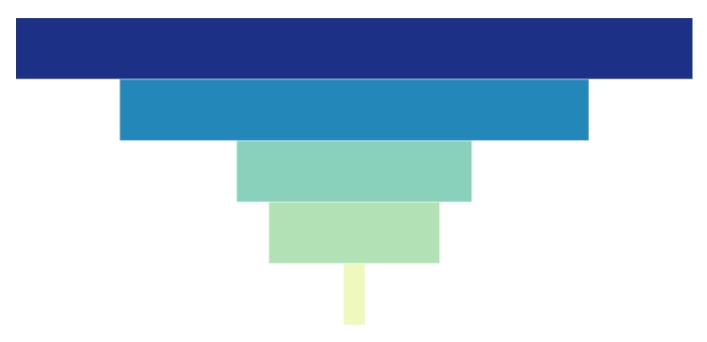 The first stage, shown at the top of the chart, typically represents the initial input of the process and corresponds with the largest stage value (and widest bar). Because value dropoff occurs as data flows through the process, each stage measures a subset of the previous stage value. As a result, the chart progressively narrows and creates a funnel shape.
