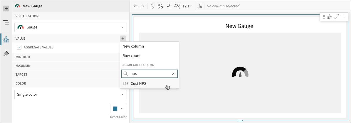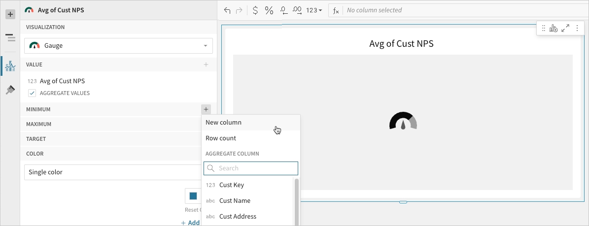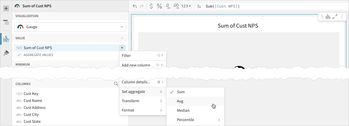 To aggregate the values of an existing column, search or scroll the Aggregate column list and select the preferred column name.