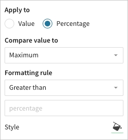 When you create a percentage-based rule, Analytics Pro evaluates the measure or gauge scale value relative (as a percentage) to the maximum or target value, depending on the rule configuration. If the percentage meets the conditions defined in the Formatting rules field, the colour selected in the Style field applies to the gauge fill or gauge scale.