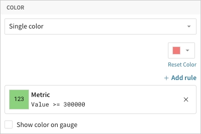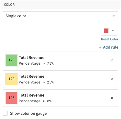 When you select Single colour in the Element properties > Colour property, you can configure formatting rules (+ Add rule) that determine the gauge fill or gauge scale colour according to value- or percentage-based conditions.