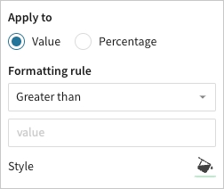 When you create a value-based rule, Analytics Pro evaluates the measure or gauge scale value. If the value meets the conditions defined in the Formatting rule fields, the colour selected in the Style field applies to the gauge fill or gauge scale.