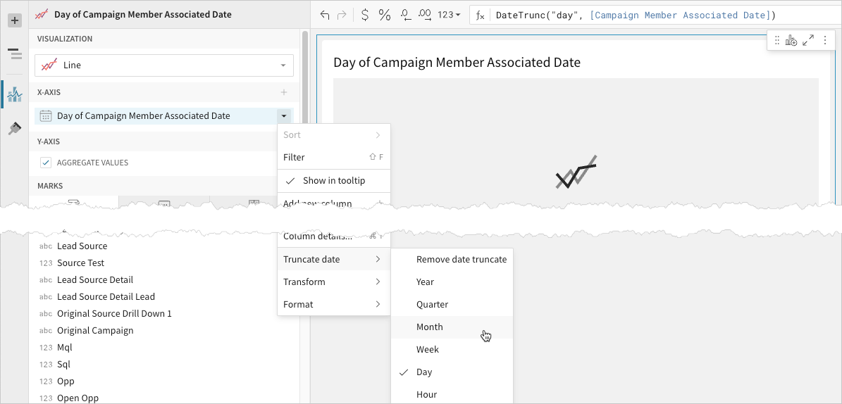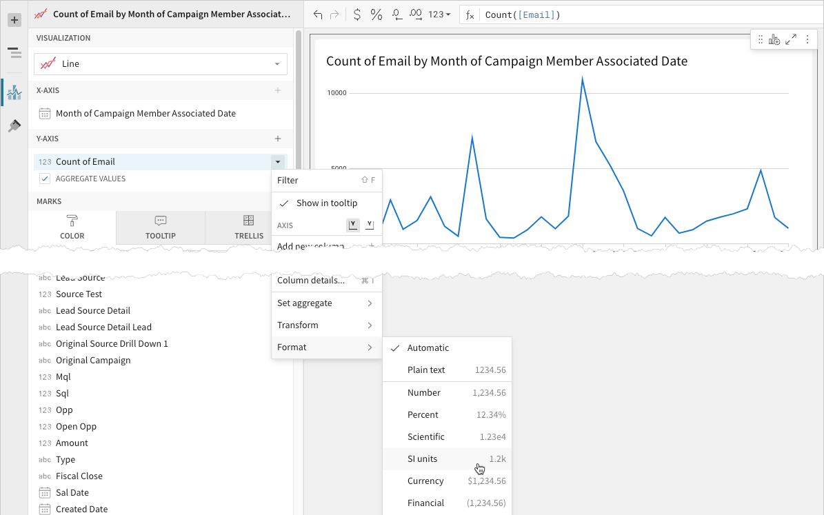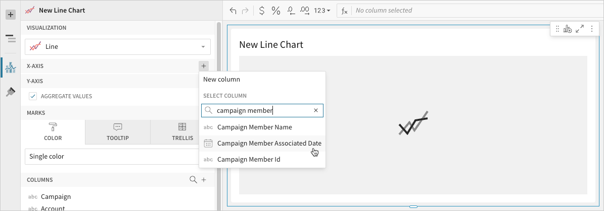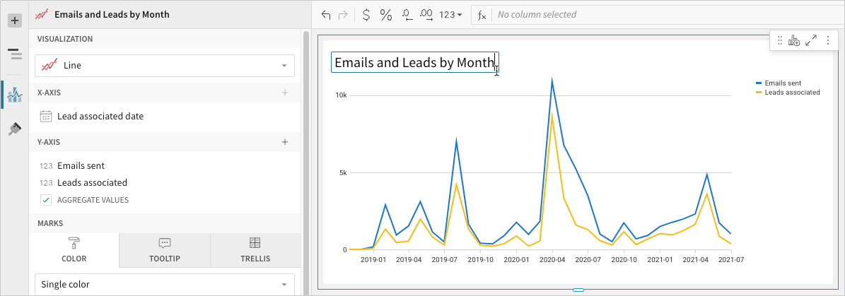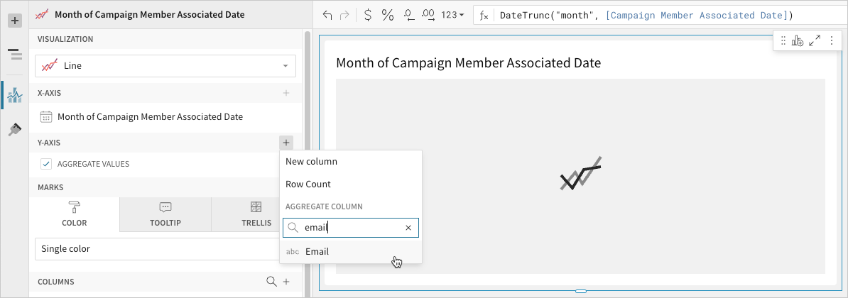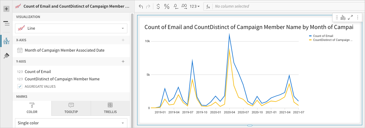 - 📘To plot the source column data without aggregating values, clear the Aggregate values checkbox in the Y-axis property. If this results in an incomplete chart that exceeds the 25,000 data point limit, reaggregate the values or apply data filters to reduce the number of data points.💡You can also use the toolbar to change the aggregation method (using the formula) and data label format.