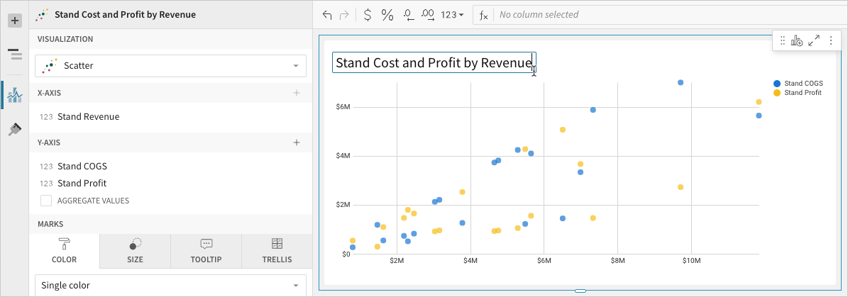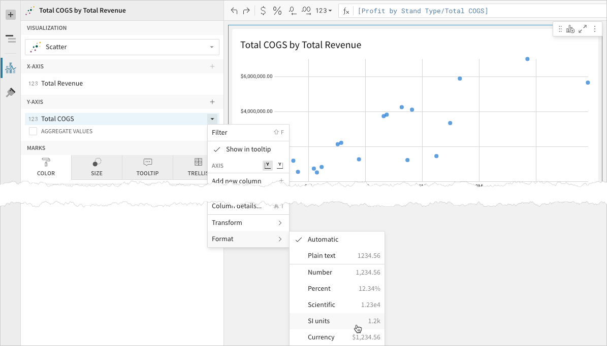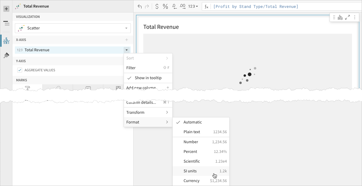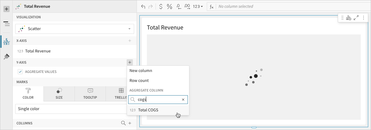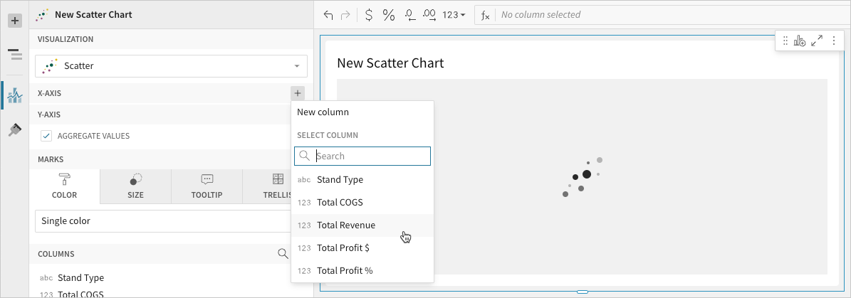 📘As with the axis variables, you can control how the size variable source column data is calculated and displayed in the chart.