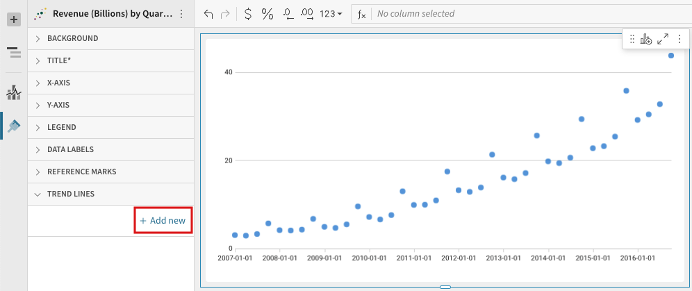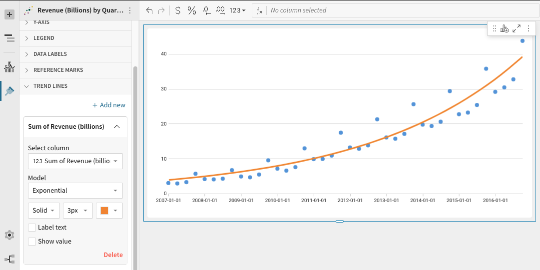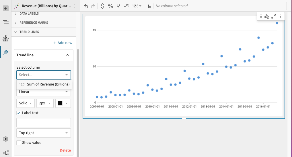 To select a new column to use for the trend, pick a column under Select column. The available list contains only columns plotted on the visualisation's Y-AXIS.