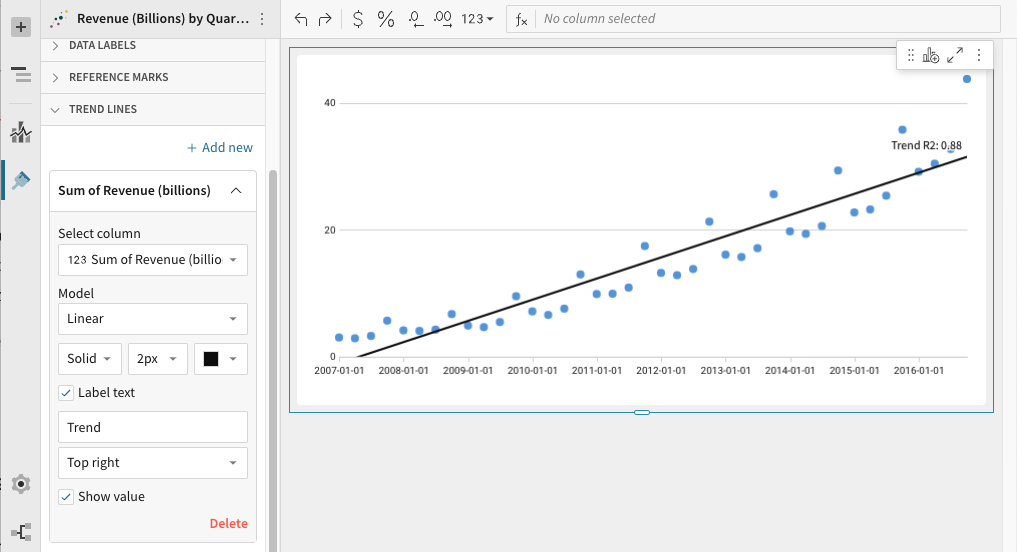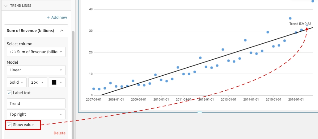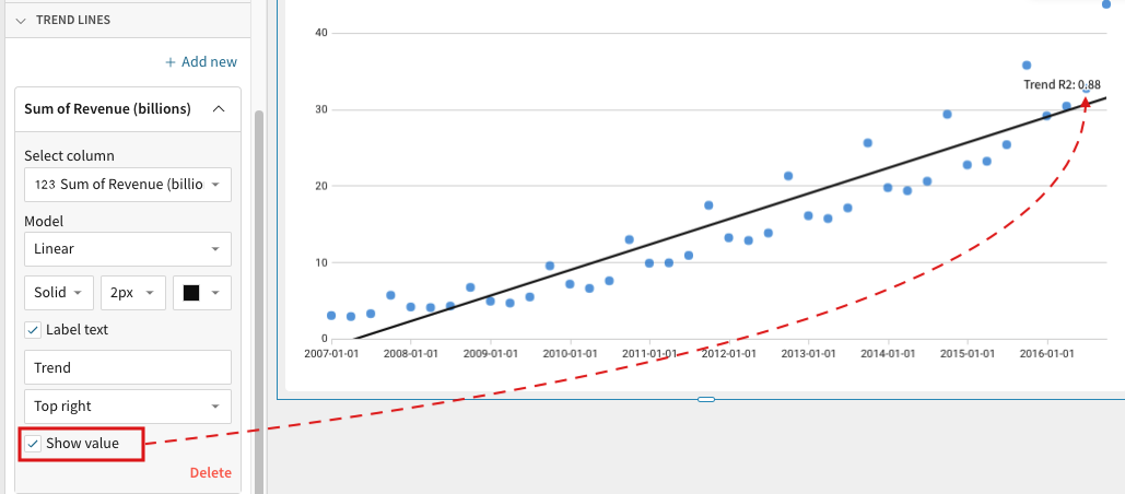To include the R² value on a visualisation's trend line, check the trend line's Show value option in the editor panel. The value will appear wherever the trend line label is positioned in relation to the line.