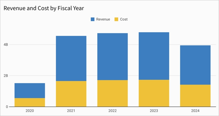 No trellising: This initial chart shows a basic view that compares total revenue per fiscal year from 2019 to 2023. The stacked bars differentiate revenue for each product family, providing an additional dimension to explore within and across each year.