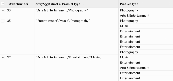 For each grouping (grouped by order number) the ArrayAggDistinct function returns an array containing distinct non-null values—sorted in ascending order—from the corresponding rows in the Product Type column.