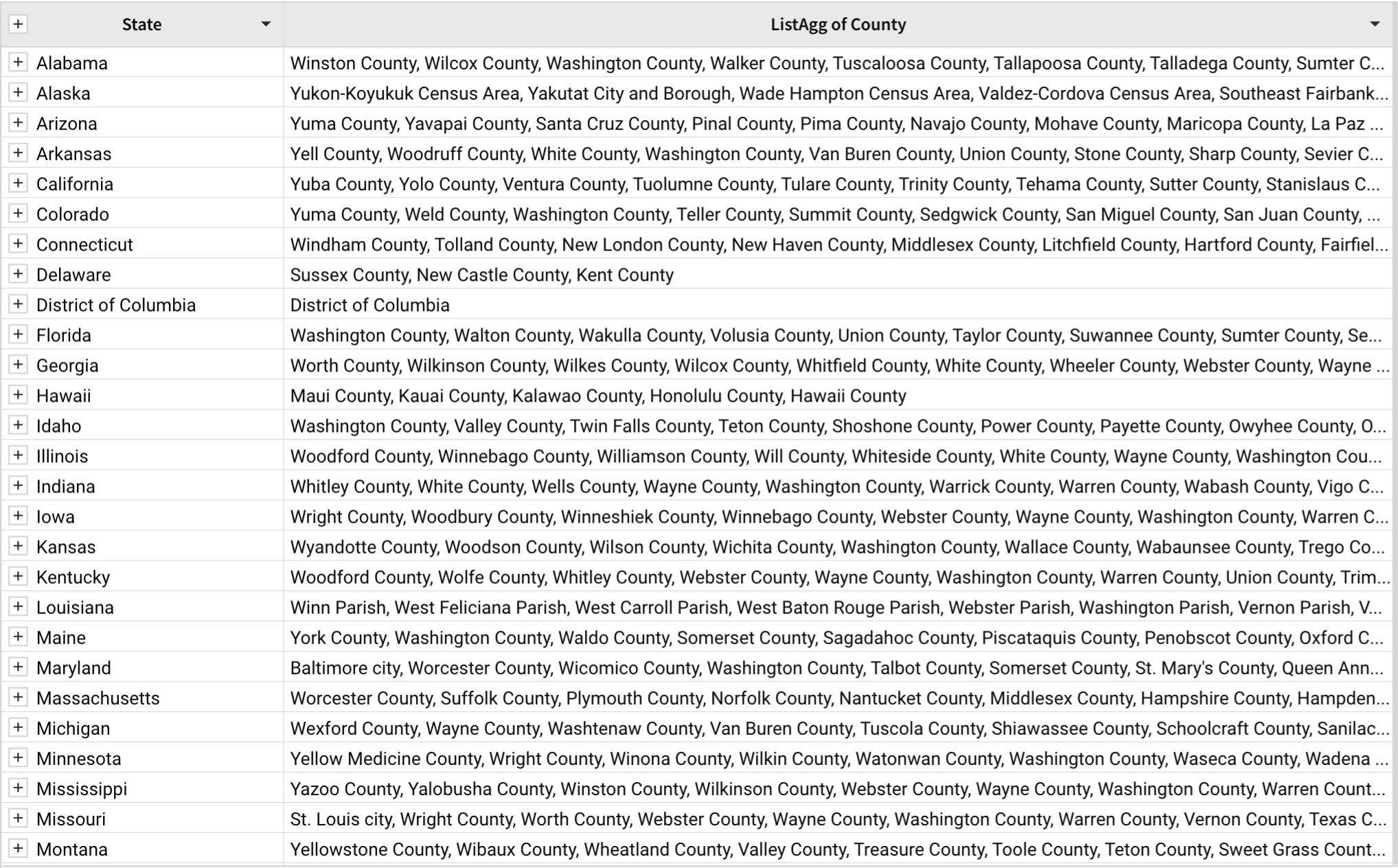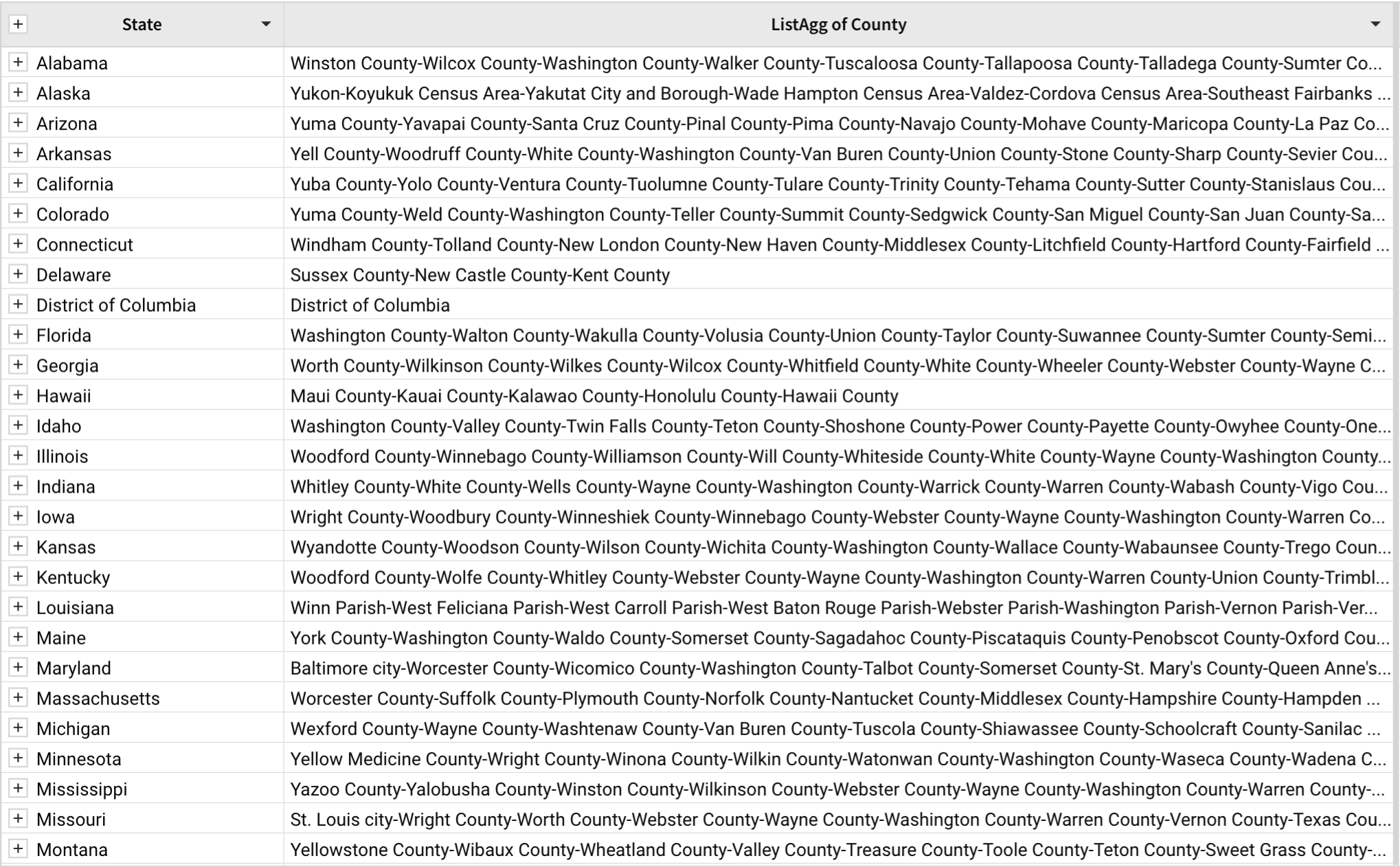 A table contains a grouped [State] column and an associated [County] column. You can use the ListAgg function to create an list of all counties within each state. Here, no separator is indicated, so it defaults to a comma.