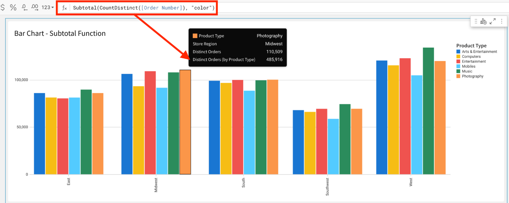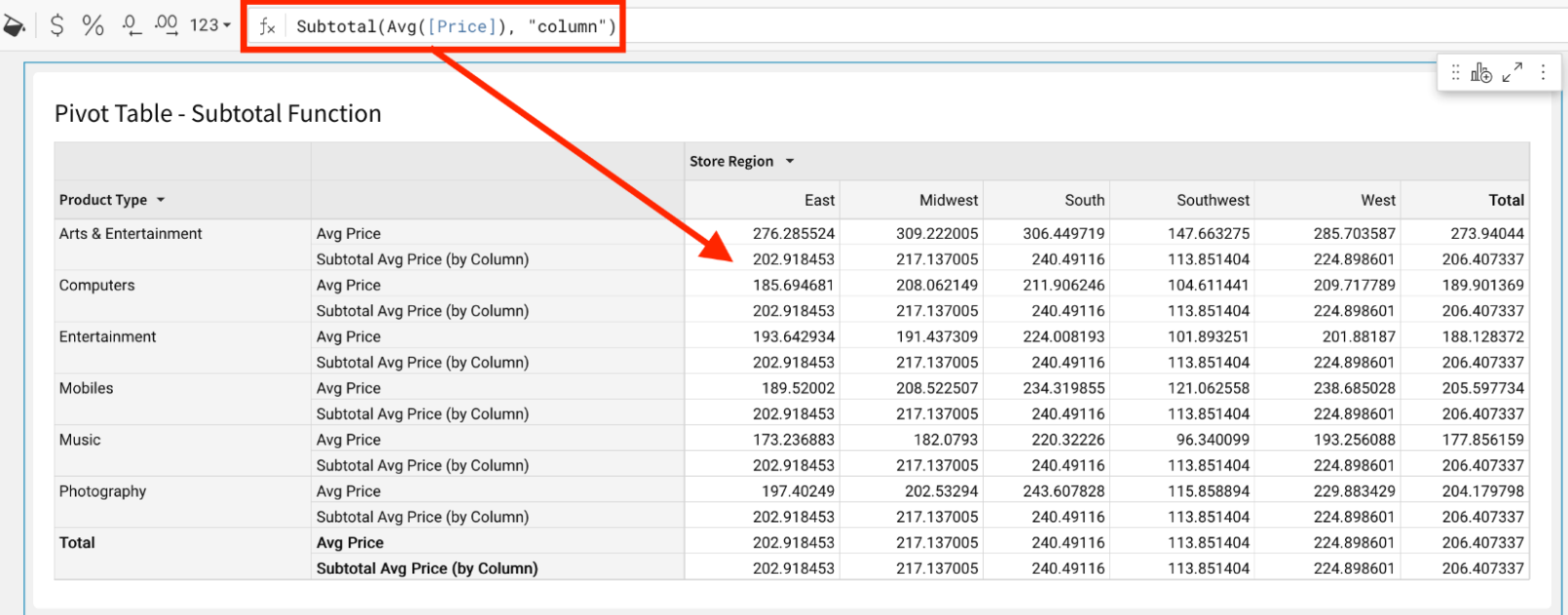 Calculates the aggregate subtotal for each Product Type, across all values of Store Region.