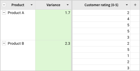 Variance([Customer rating (0-5)])When you calculate the formula in the Product grouping, the function returns the sample variance for each product. This example indicates a broader range of customer ratings for Product B.