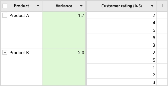 When you calculate the formula in the Product grouping, the function returns the sample variance for each product. This example indicates a broader range of customer ratings for Product B.