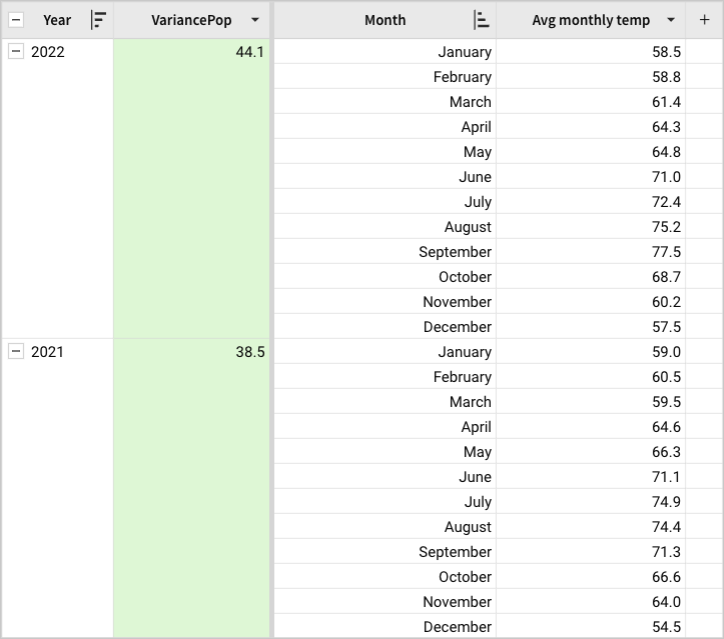 VariancePop([Avg monthly temp])When you calculate the formula in the Year grouping, the function returns the population variance for each year. This example indicates greater temperature fluctuation in 2022.