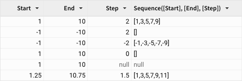 null, the function returnsnull.The sequence range can be increasing (starts with a lower value and ends with a higher value) or decreasing (starts with a higher value and ends with a lower value).