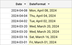 Evaluates date values in the Date column and returns text strings formatted to include the abbreviated weekday name, full month name, two-digit day of the month, and four-digit year, with commas following the weekday name and day of the month.