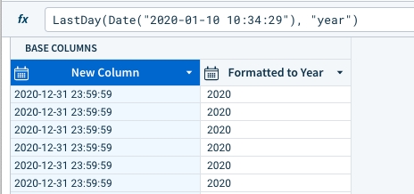 The LastDay function evaluates a specified date component (i.e., year, quarter, month, or week) in a date value and returns the last date and time in that component as a timestamp.