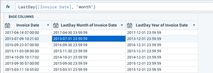 Extracts the month component from the date in the Invoice Date column and returns the last date and time for that month.