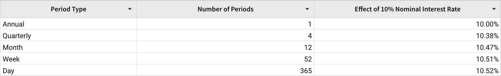Explore how the the effective annual interest rate changes when the nominal interest rate is 10% applies to investments with a different number of periods.