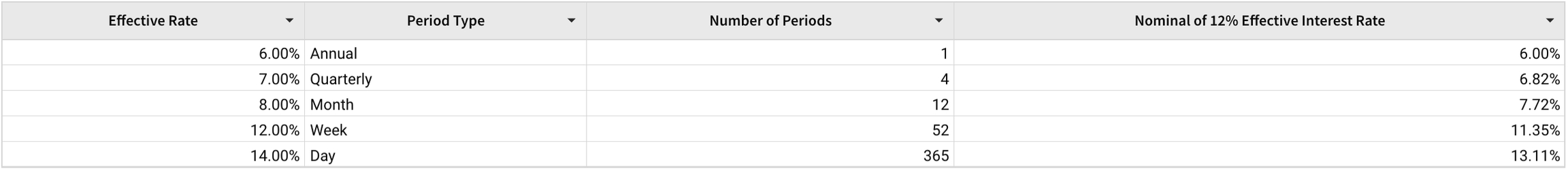 You can use the nominal function to explore the change in the nominal interest rate based on the number of times it compounds.