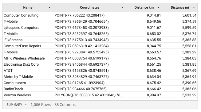 The Distance function returns the following values for the Coordinates column, when specifying distance in either kilometers or miles from coordinates (0, 0):