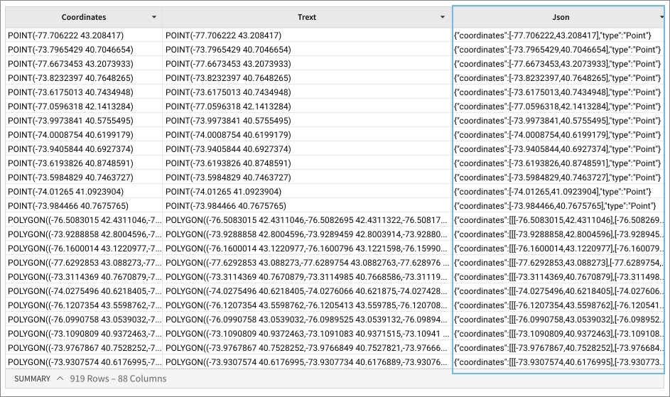 Returns GeoJSON values for the geography data in the Coordinates column.