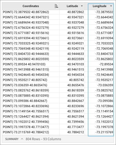 The function Longitude extracts the latitude of a point from the Coordinate column: