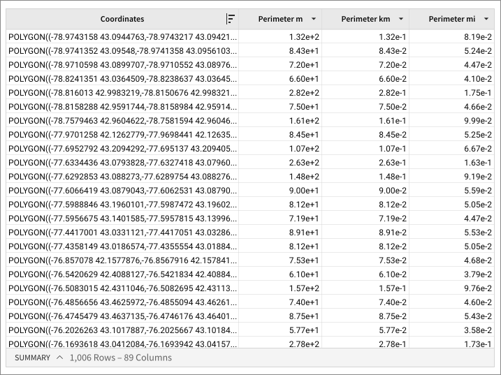 Perimeter(units, polygon)Perimeter("meters", [Coordinates])Perimeter("kilometers", [Coordinates])Perimeter("miles", [Coordinates])