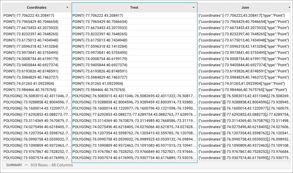 The Text function converts the geography data type into a Well-known text (WKT) representation of geometry format.