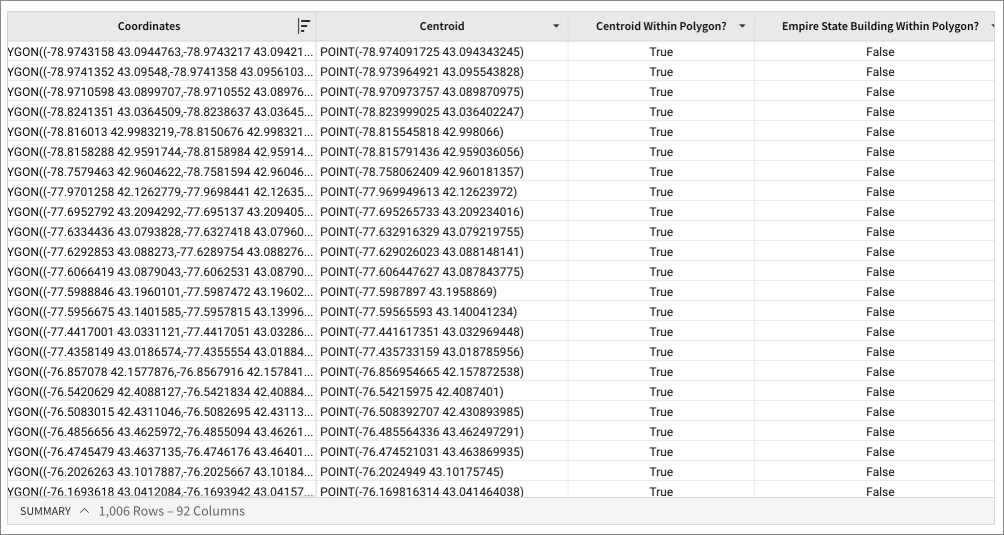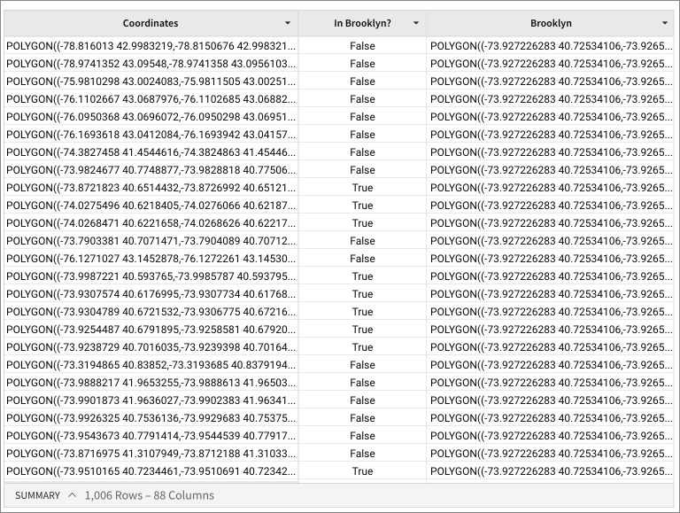 Within(Geography("POLYGON((1 1, 2 1, 2 2, 1 2, 1 1))"), Geography("POLYGON((0 0, 3 0, 3 3, 0 3, 0 0))"))Within([Centroid], [Coordinates])Within(MakePoint(-73.985428, 40.748817), [Coordinates])