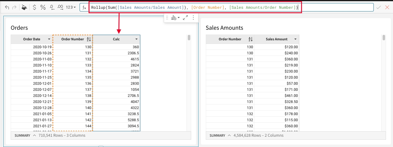 Rollup(Sum([Sales Amounts/Sales Amount]), [Order Number], [Sales Amounts/Order Number])