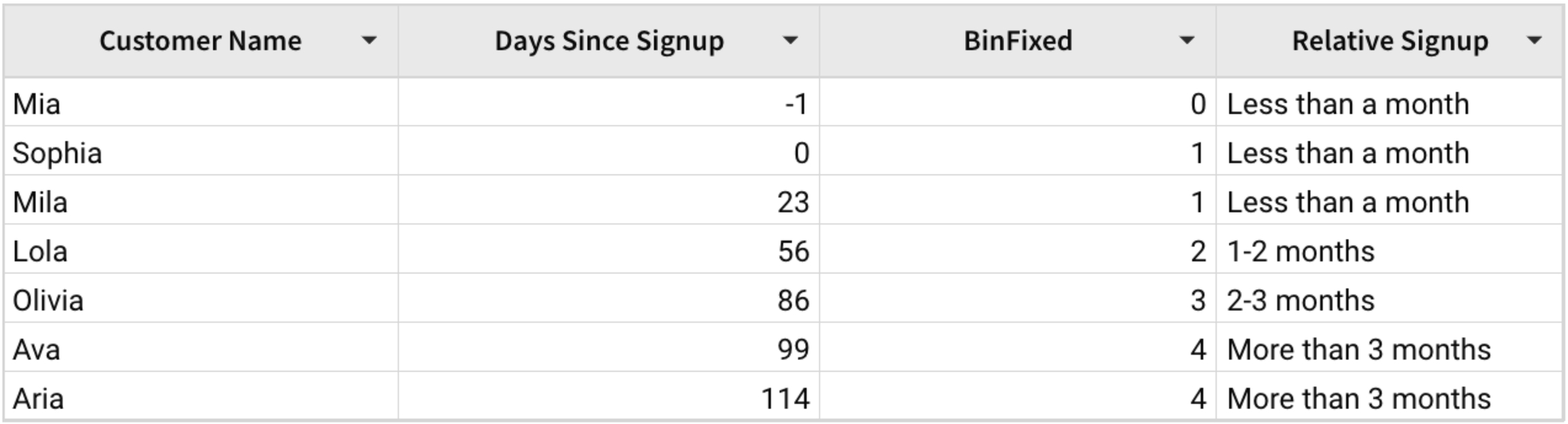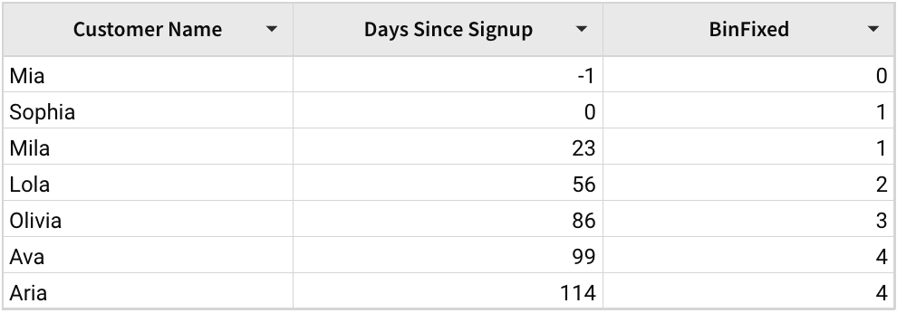 The values in the Days Since Signup column are assigned to one of 5 bins: