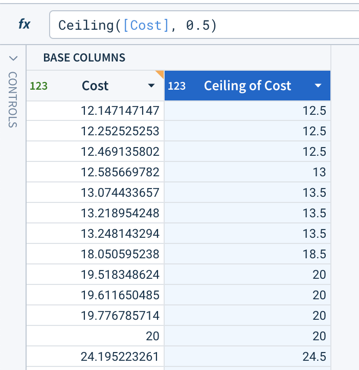 (4) Returns the Ceiling at a factor of 0.5 for each row in the input column.
