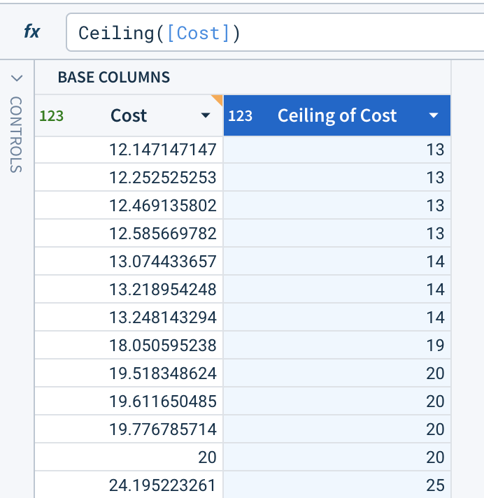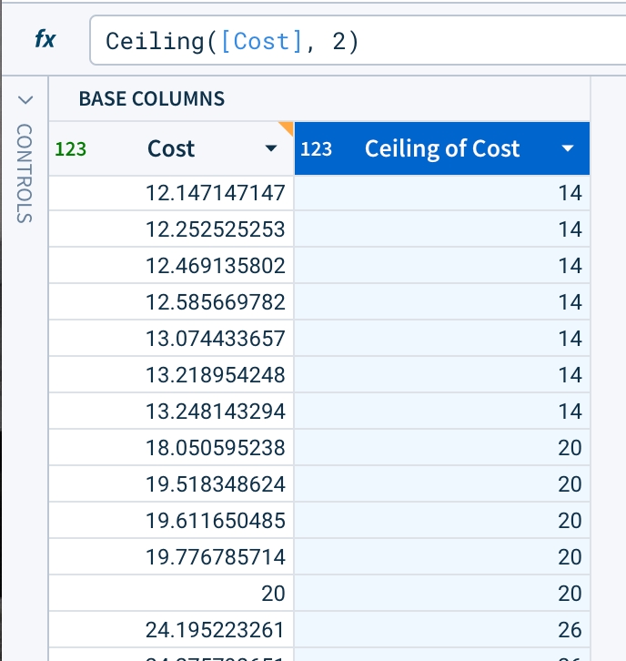 (6) Returns the Ceiling at a factor of 2 for each row in the input column.