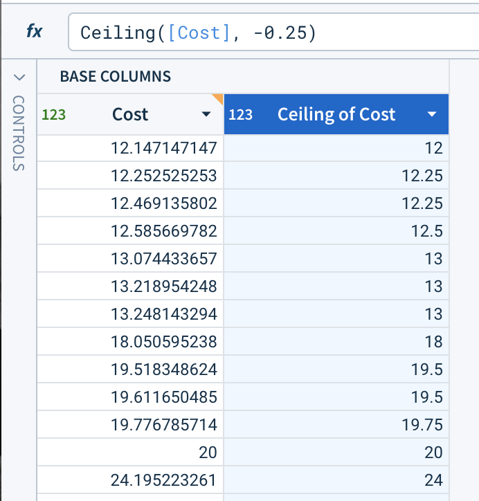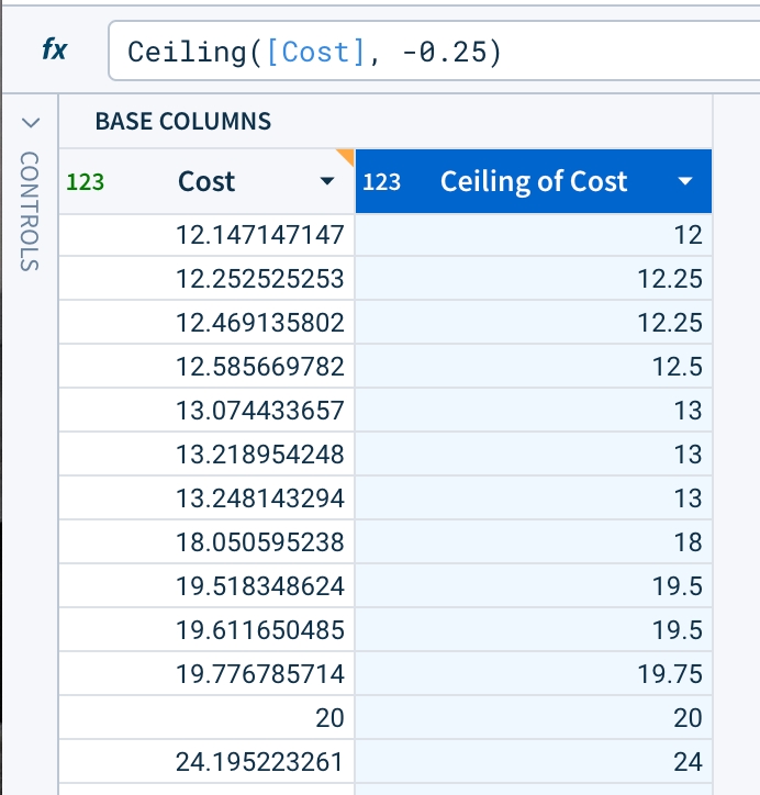 (5) Returns the Ceiling at a factor of -0.25 for each row in the input column.