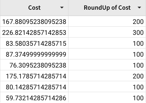 Rounds the value for each row in the input column up. Numbers are rounded by 2 digits.