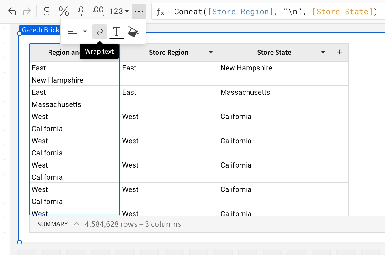 When the newline character () is added as an argument, Concat generates the subsequent argument on a new line. To view the output on separate lines, ensure Wrap text formatting is applied to the column.