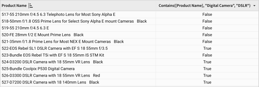 when either "Digital Camera" or "DSLR" is found as a substring in the product name (text value in the Product Name column). Otherwise, the function returns False