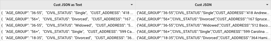 Returns Json values for the variant data in the Cust JSON as Text column.