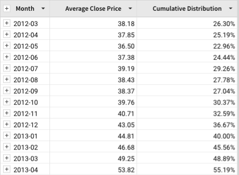 A table contains monthly averages for the close prices of a stock. The CumeDist function can be used to find the cumulative distribution of these average close prices.