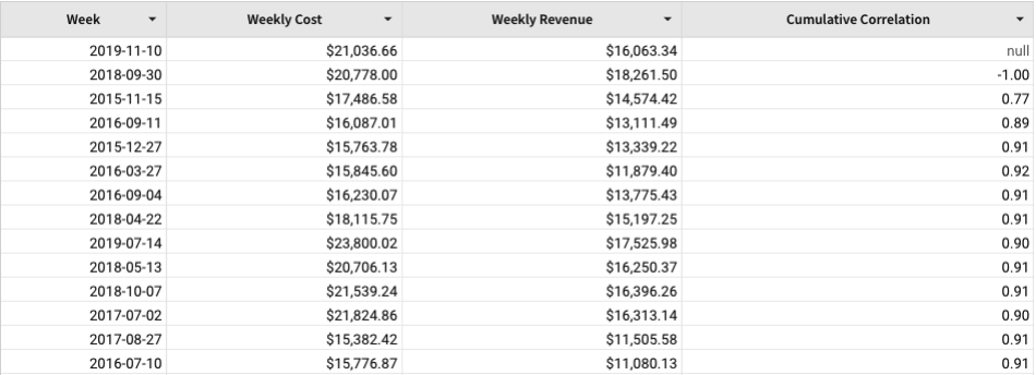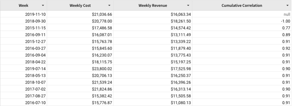CumulativeCorr([Weekly Cost], [Weekly Revenue])