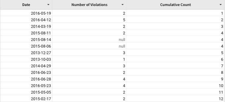 A table contains data for restaurant inspections by day. The CumulativeCount function can be used to count the amount of days with at least one violation up to and including the current day.