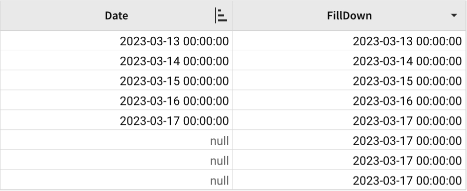 A table contains various dates. The FillDown function will replace every null value within the [Date]
