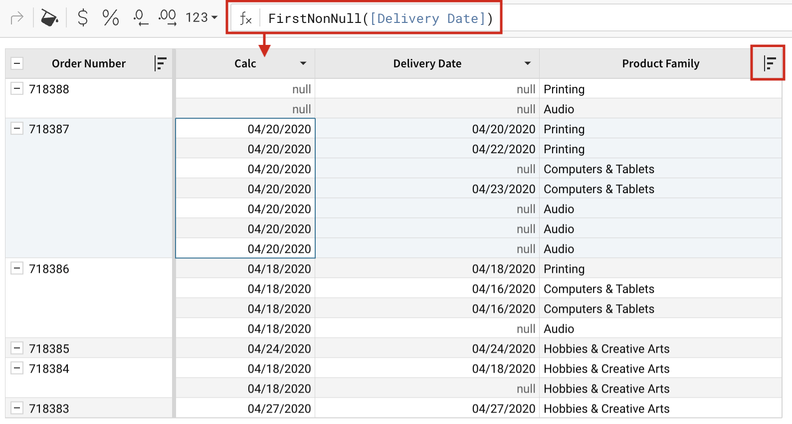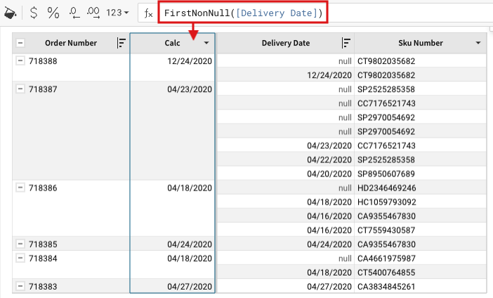 The resulting calculations are dependent on the group’s sort order. In this example, the group of columns in which FirstNonNull() is calculated is sorted by the [Product Family] column. This sort order impacts the order of the [Delivery Date] column, which is then passed to FirstNonNull() in the [Calc] column.