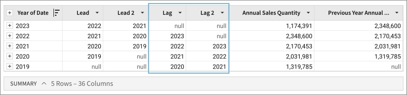 In these examples, column Lag shows the offset lag as the default of 1 row and the default is null, while column Lag 2 shows the offset lag as 2 rows and the default is null.