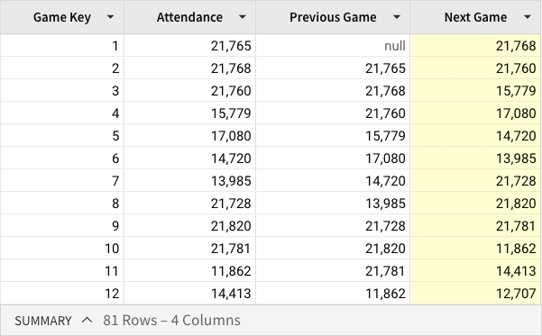 The formula references the Attendance column and shifts its values up one row. The resulting output in each row of the Next Game column indicates the number of people who attended the game that occurred immediately after the one referenced in the Game Key column.
