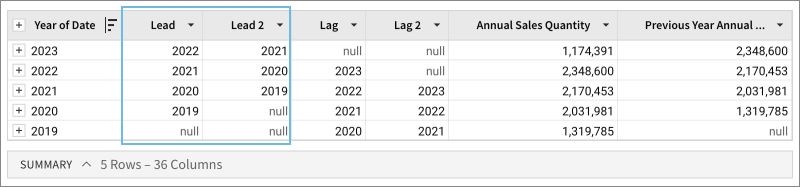 Lead([Year of Date])In these examples, the column Lead shows the offset lag as the default of 1 row and the default is null, while column Lead 2 shows the offset lag as 2 rows and the default is null.