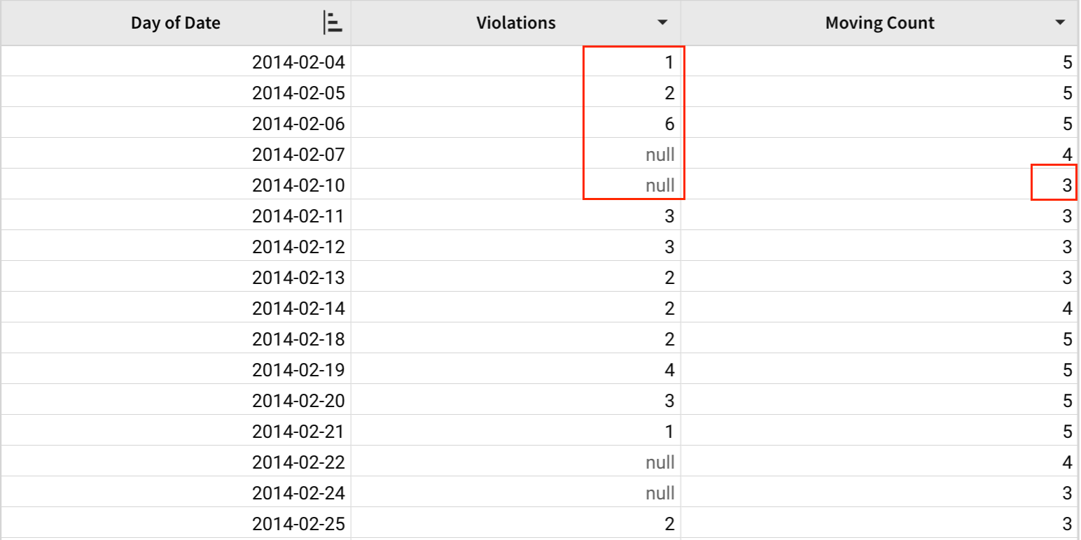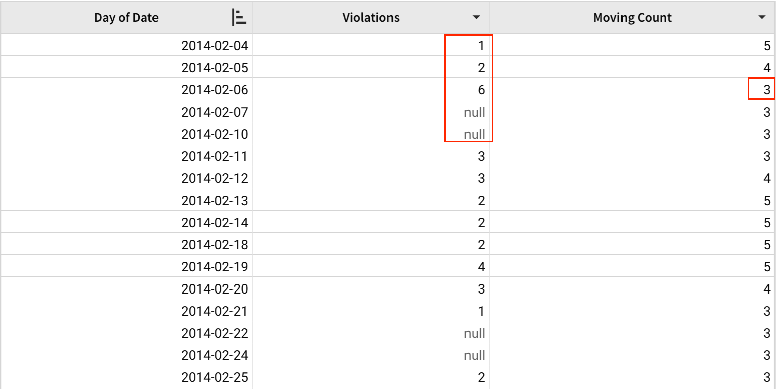 MovingCount([Violations], 4)With [Violations] as the column argument and 4 as the above argument, the number of non-null values are calculated for each day along with the four previous days. Since the below argument was not specified, it defaults to 0.