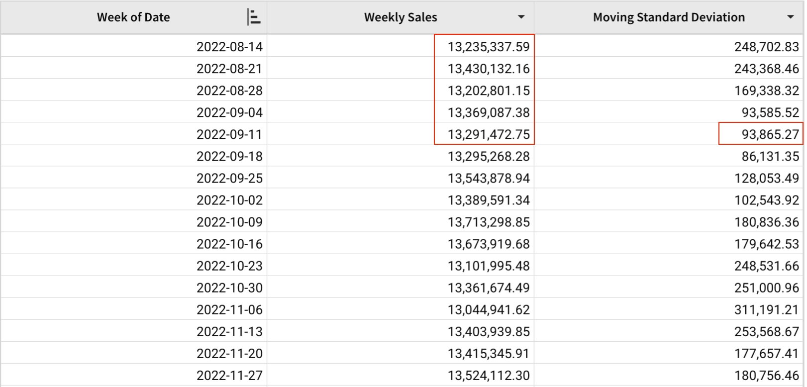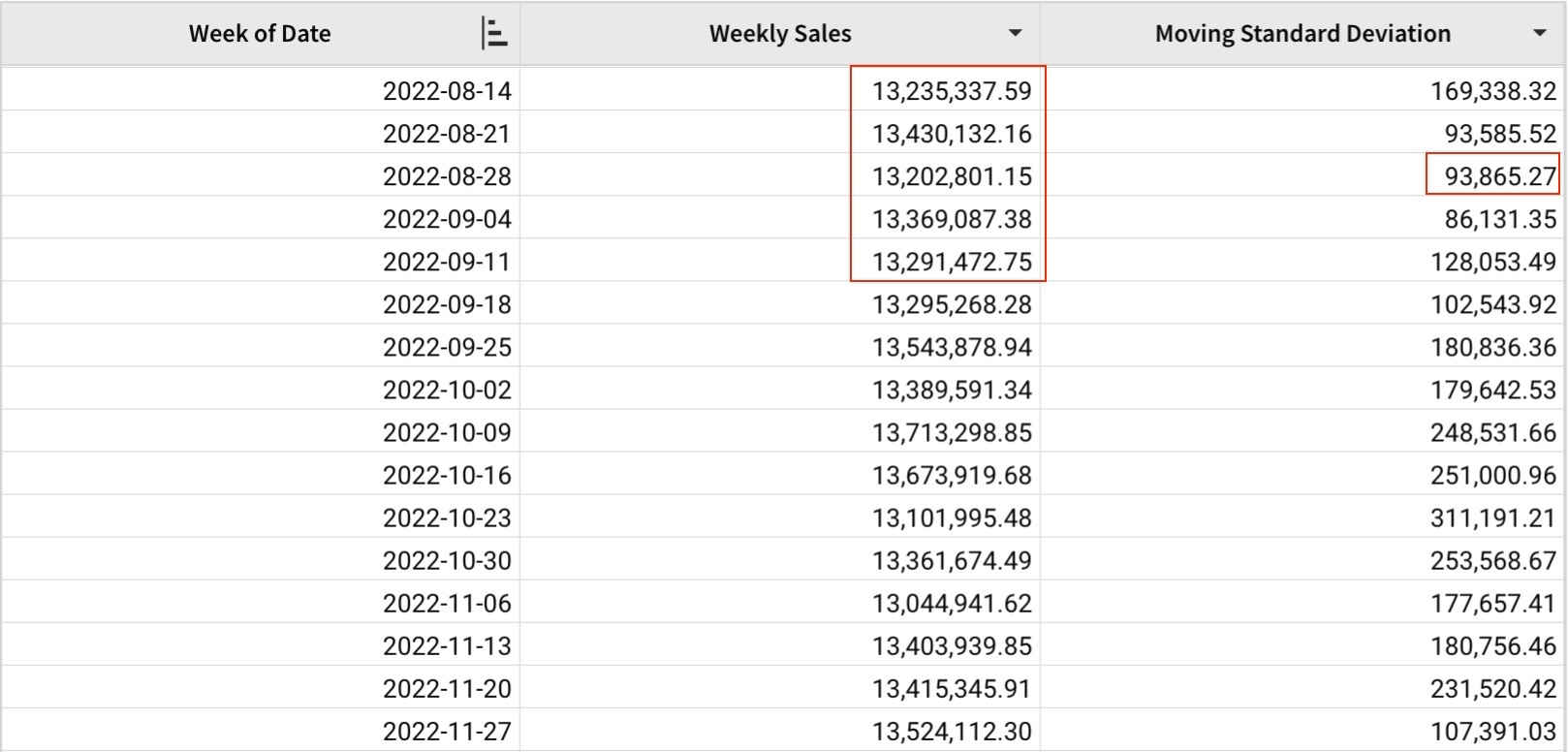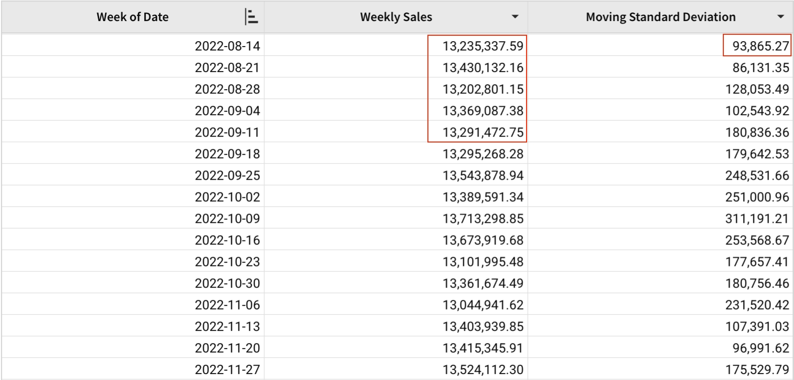 With [Weekly Sales] as the column argument and 4 as the above argument, the standard deviation of the weekly sales is calculated for each week along with the four previous weeks. Since the below argument is not specified, it defaults to 0.